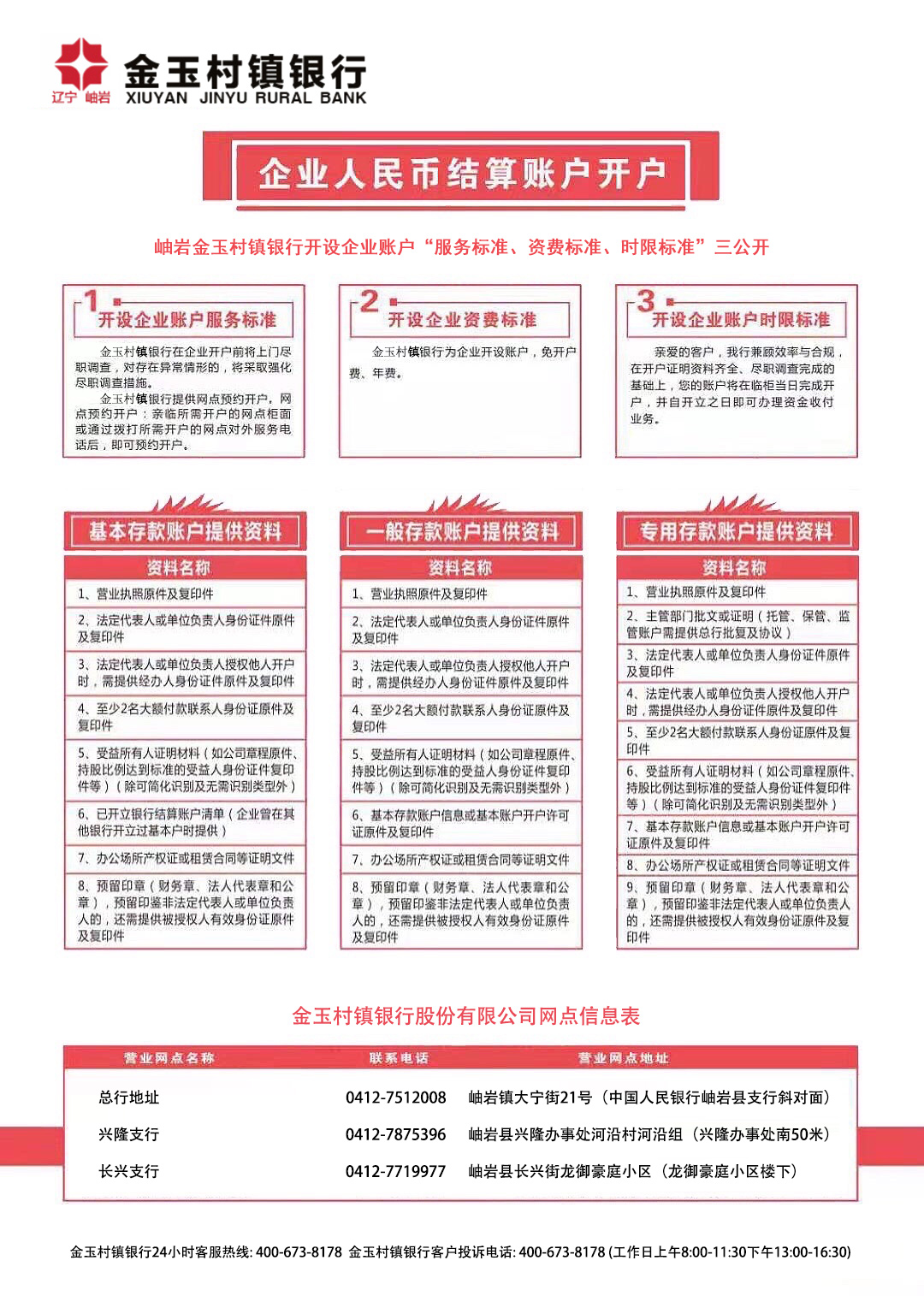 岫巖金玉村鎮(zhèn)銀行開設(shè)企業(yè)賬戶“服務(wù)標(biāo)準(zhǔn)、資費(fèi)標(biāo)準(zhǔn)、時(shí)限標(biāo)準(zhǔn)”三公開
